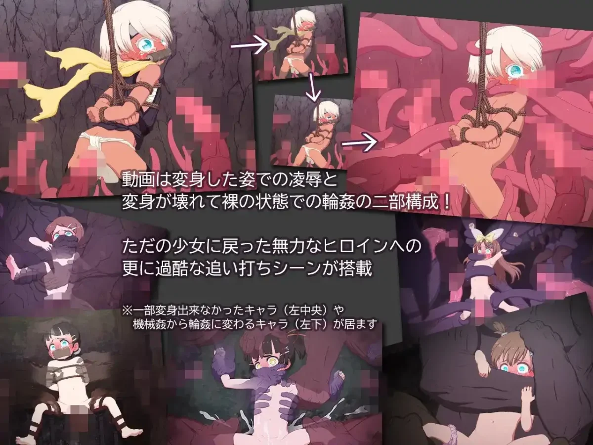 魔法少女や怪盗など様々なタイプのつるぺた変身ヒロイン達が負けた相手に犯され尽くしていく。